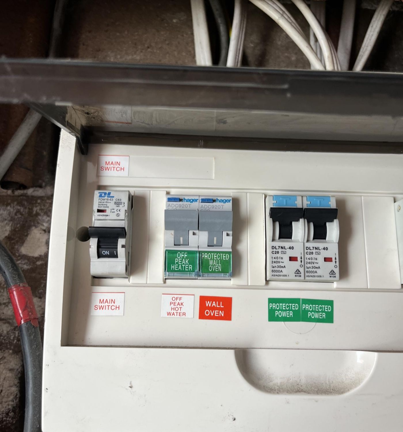 At the switchboard, we found two circuits that looked protected but weren’t , so we swapped those out for proper RCDs to make sure the job met current safety standards.